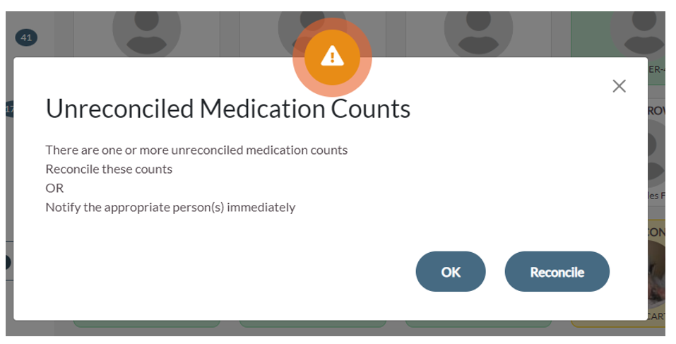 Note: Continuing without checking in will cause the inventory of this medication to become negative.Unreconciled Medication Counts - There are one or more unreconciled medication counts : Reconcile these counts or notify the appropriate person(s) immediately.