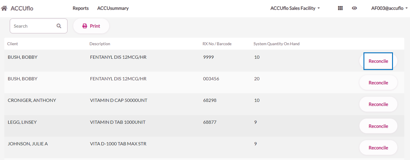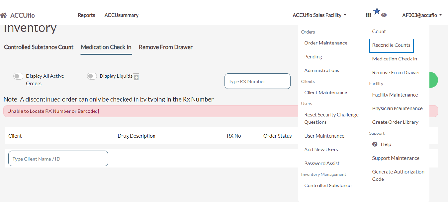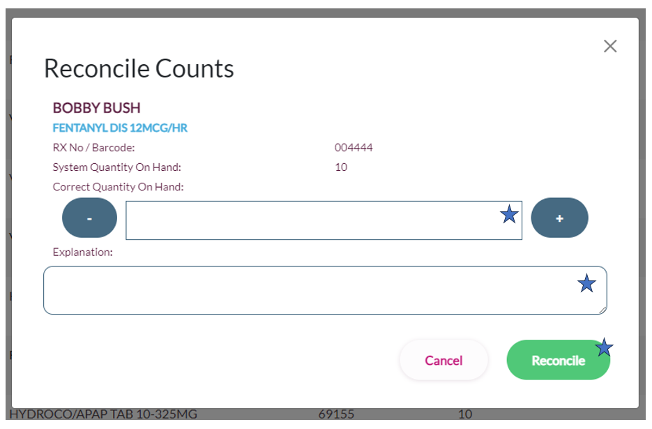 Note: This typically requires a user role of Advanced or Administrator to reconcile a medication - contact your supervisor. Use the Inventory report to determine the cause of a discrepancy. The Controlled Substance Reconciliation Report will also list all items that have been reconciled.