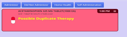 Note: Accuflo does not stop the administrations of these possible duplicates - only warns the user of the possible duplicate therapy.Possible Duplicate Therapy warnings are found on the Orders screen (Possible Duplicate Yes or No); on the Order Detail Screen; on the medication tile when it is displayed for administration; and on the Possible Duplicate Therapies screen via Maintenance