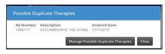 Selecting Manage Possible Duplicate Therapies will route the user to the Possible Duplicate Therapies page (also accessible via Maintenance), where the possible duplicate can be selected to determine, via order maintenance, if the order should be discontinued, (because it is a duplicate) or if it should be acknowledged. (Which means it is not a duplicate order)