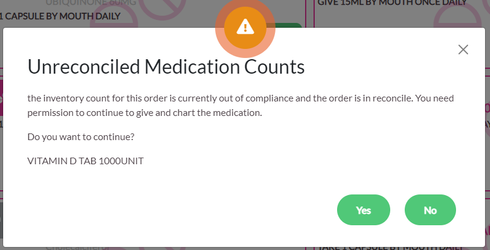 - If the selected order is in reconcile and Allow Charting while in Reconcile is active, the user will receive a prompt warning them that the inventory count is out of compliance and ask if they want to continue.