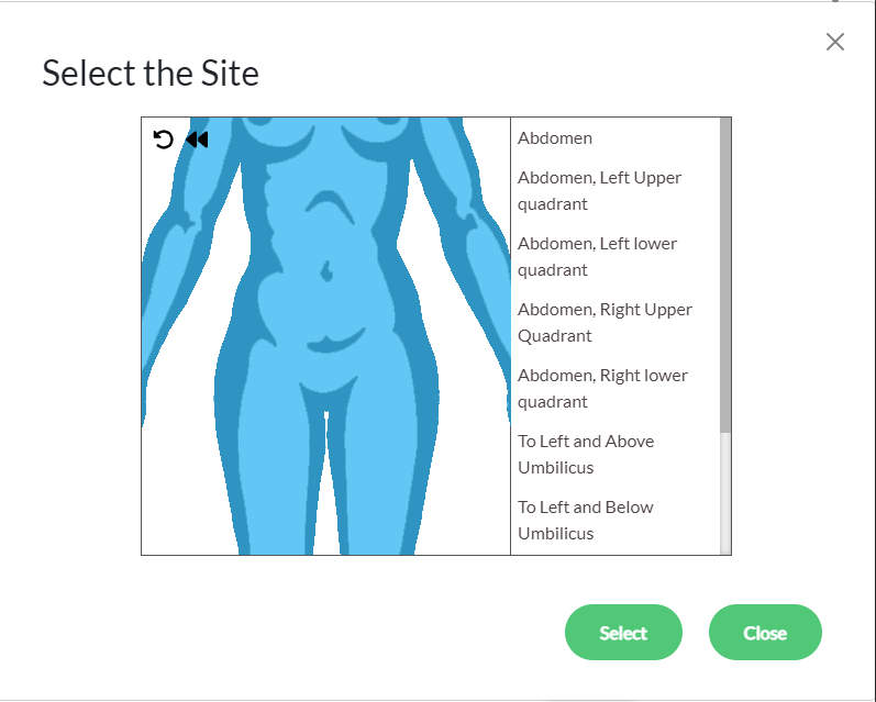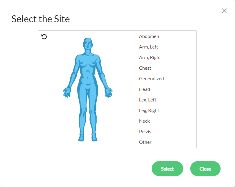 If the order requires a site to be documented, a drop-down will be available to select the site. The drop-down for Site displays a human figure, as well as site descriptions.