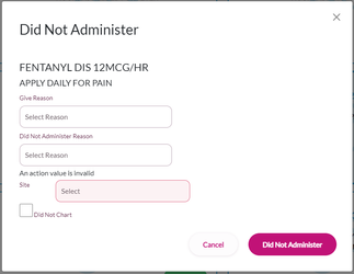 Step 4: Select the reason for not administering the order from the Did Not Administer Reason drop-down.
