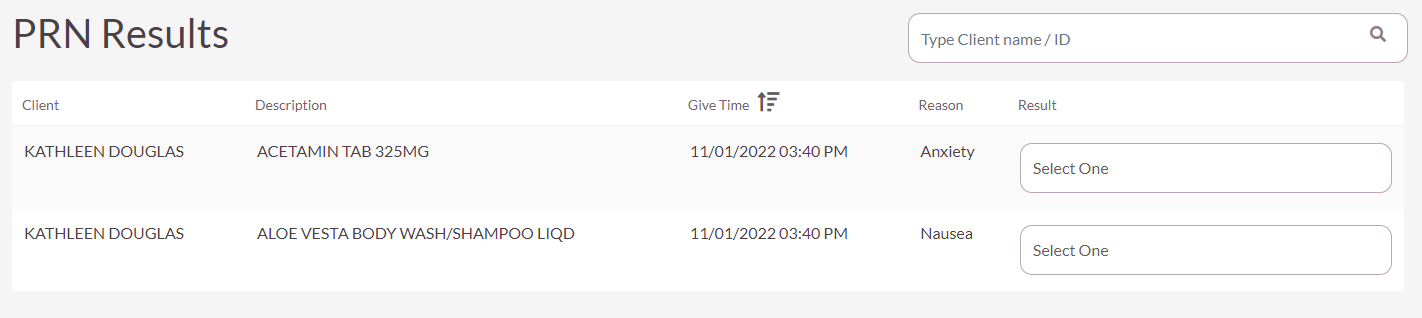 Step 4: Select the result of the PRN administration from the dropdown in the results column.