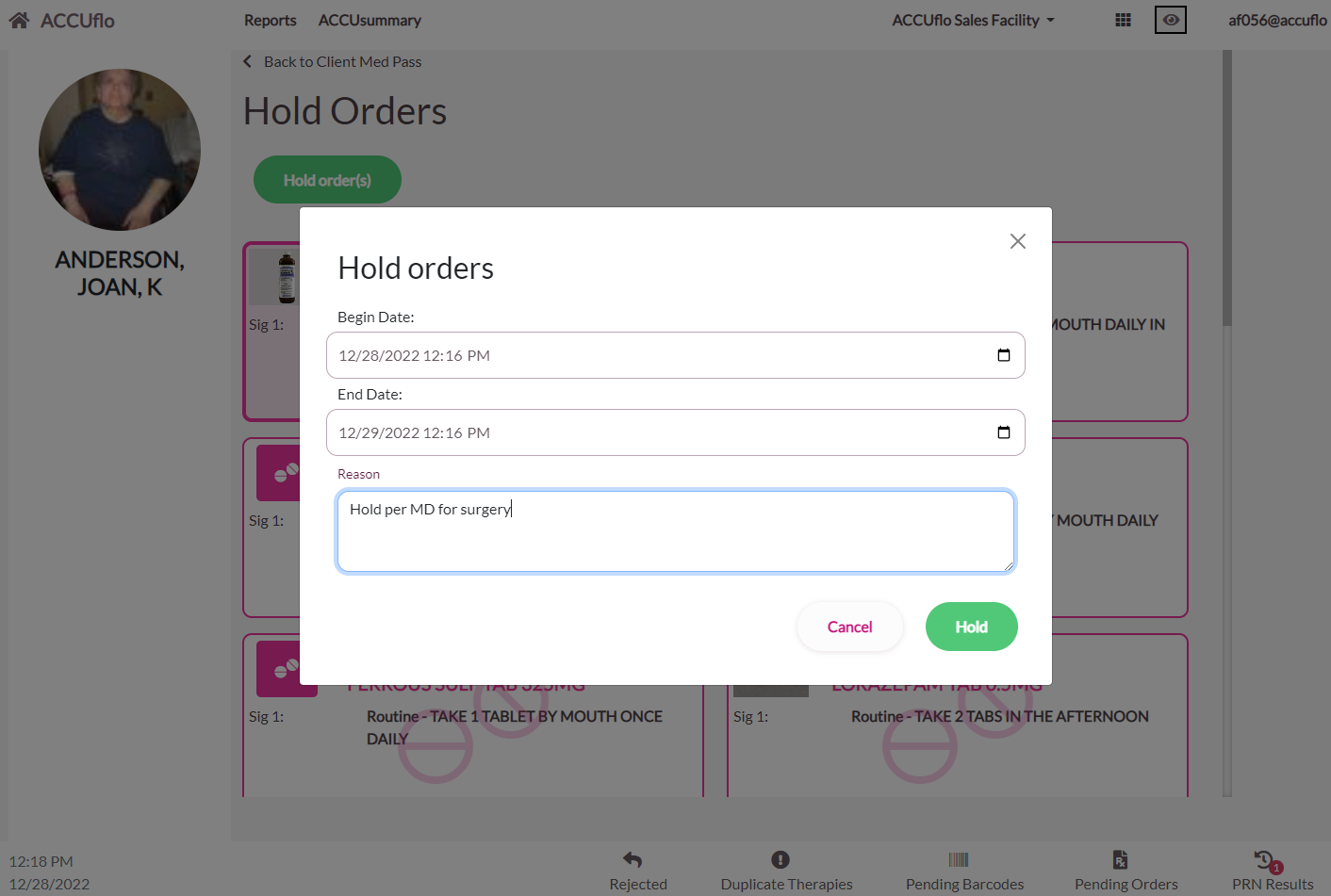 When an order is placed on hold, ACCUflo charts the order as Did Not Administer for the duration of the hold. To undo the hold, see: Procedure for Undo Administration