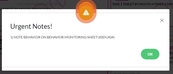 Note: Urgent Notes associated with an order, pictured below, display when the order is selected for administration. Urgent Notes that are not associated with an order display when the resident is selected.