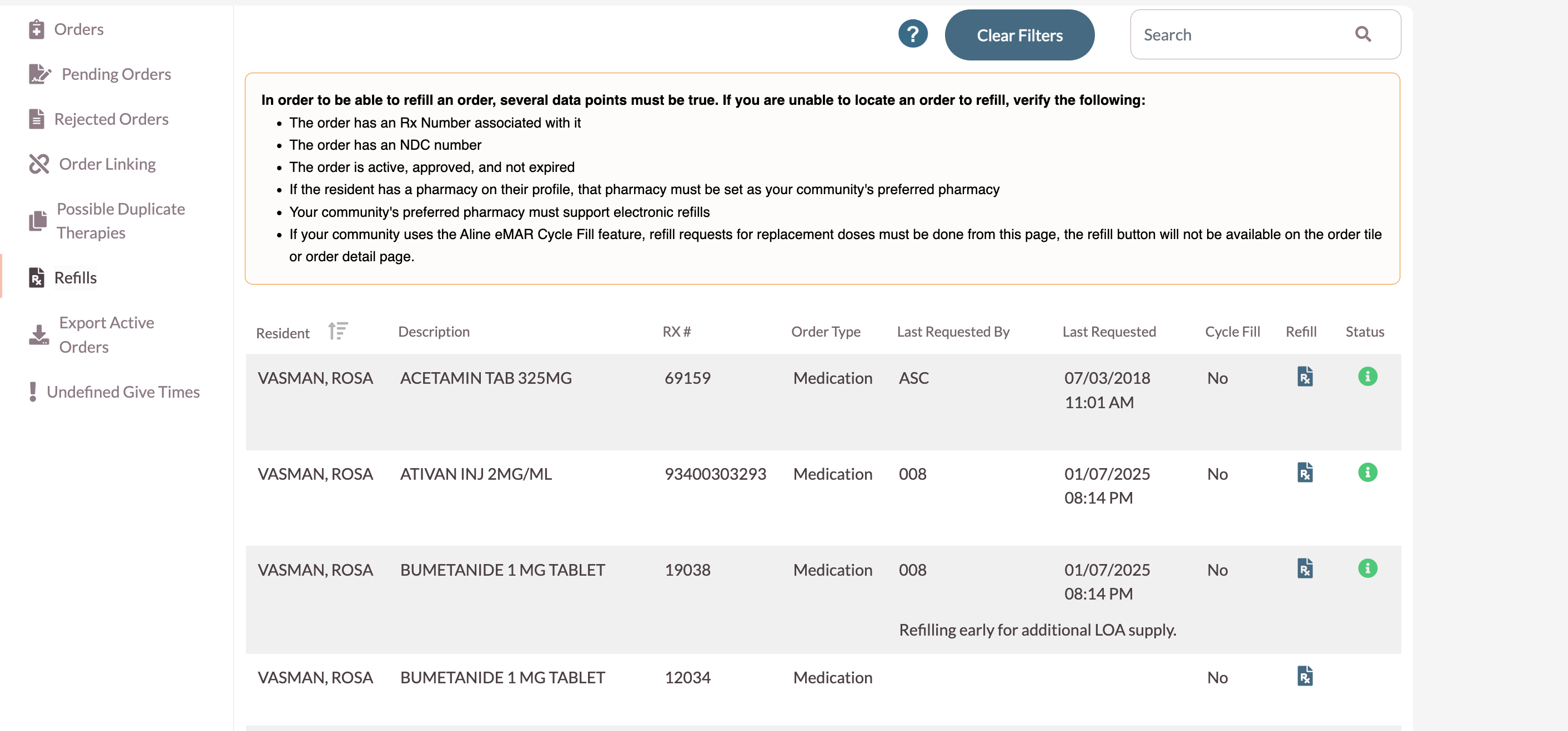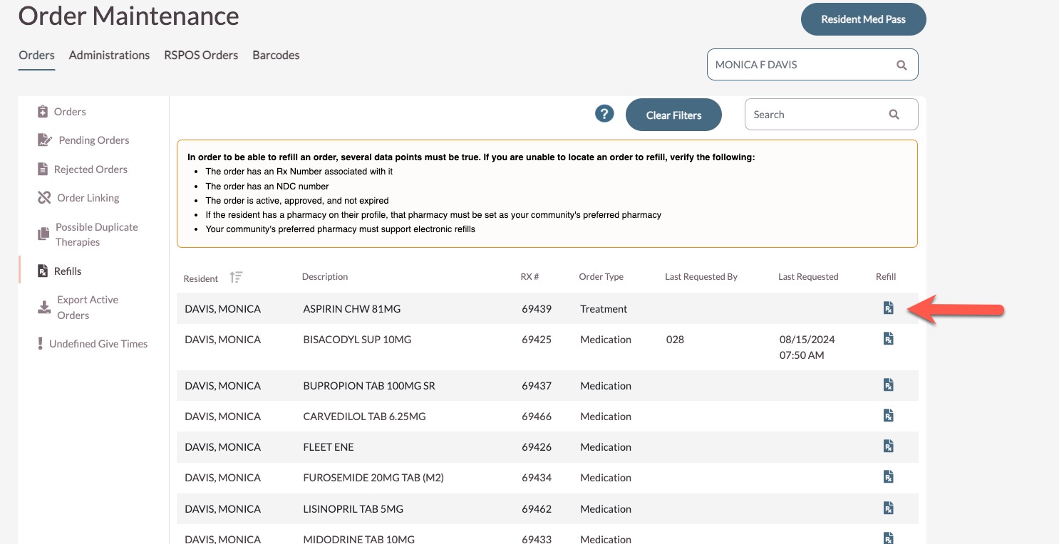 The Refills page is a useful tool for efficiently requesting multiple refills at a time along with reviewing help refill information. The refills page will display a list of the resident's active orders, RX number, order type, last user to request a refill, late refill request date and time, whether the order is in a cycle fill program, a refill button, and the refill status.