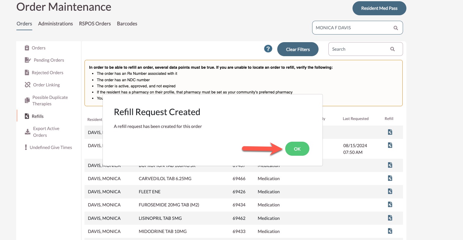 Step 4: Select OK to acknowledge the Refill Request Created message.