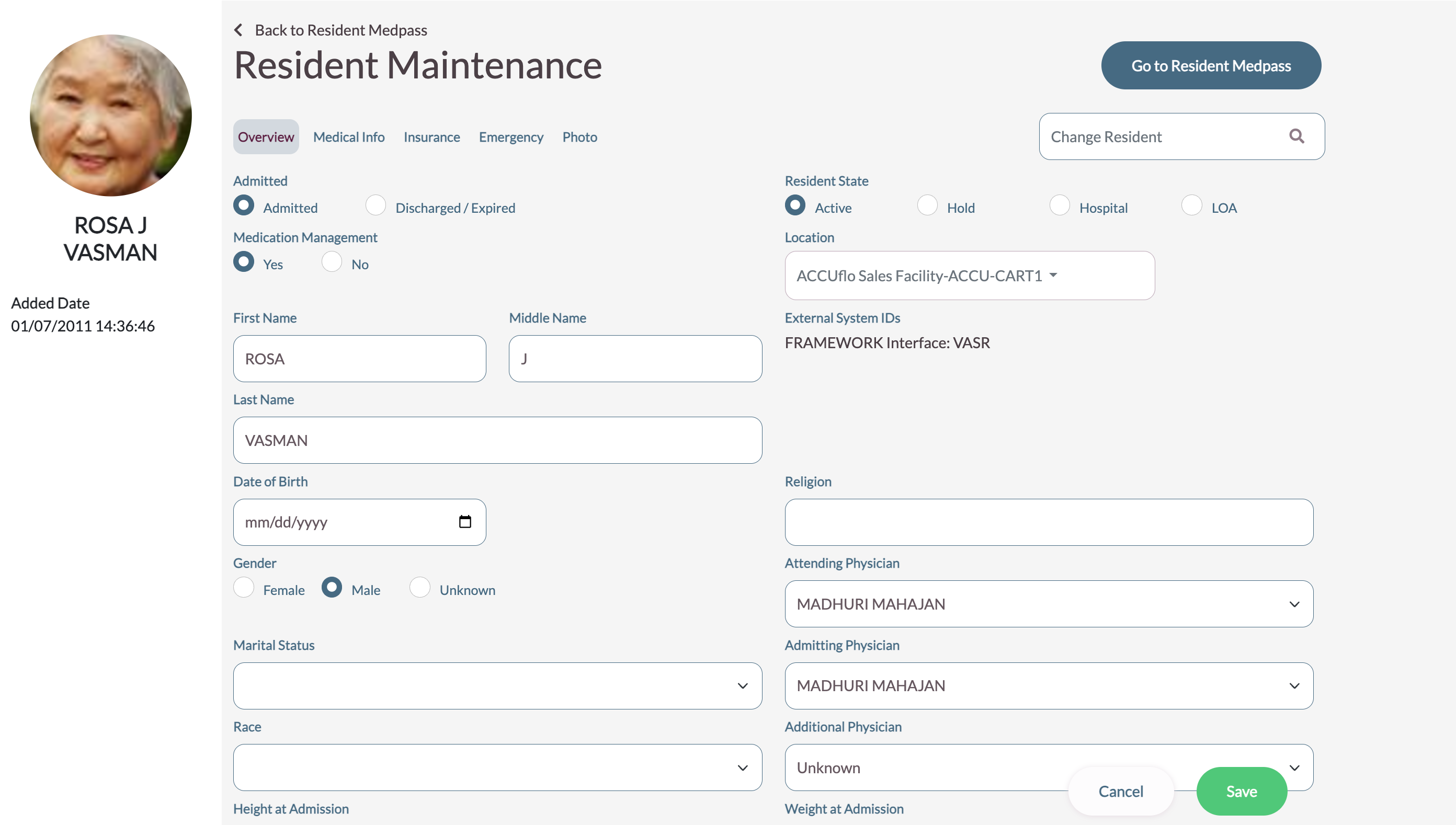• Admitted: This field can be edited. Selected admitted or discharged based on the resident’s admission status in the community.