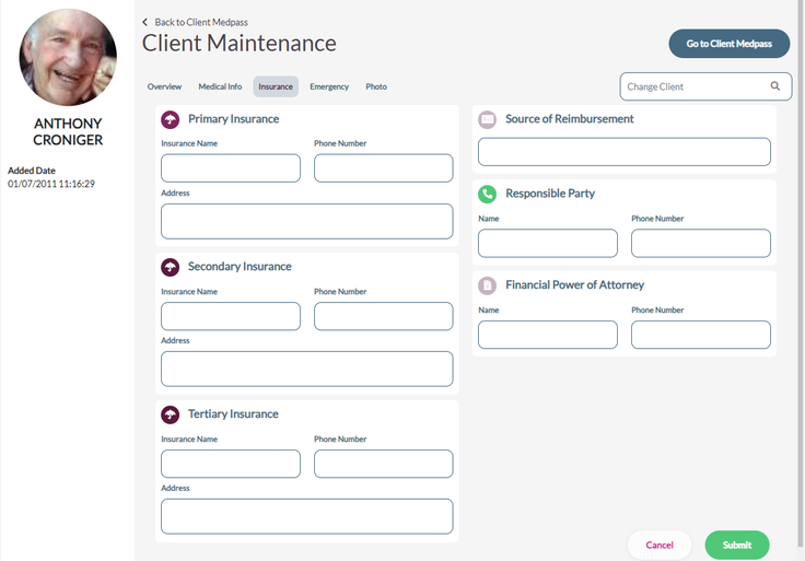 - Review the information and make changes as needed per the community’s policy. Several fields below will also print out on the Face Sheet report, such as primary insurance, secondary insurance, and responsible party.