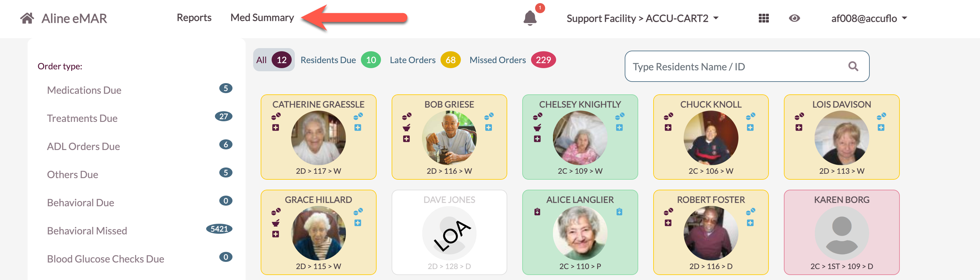 Step 1: After logging into the Aline eMAR application, select Med Summary at the top of the page.