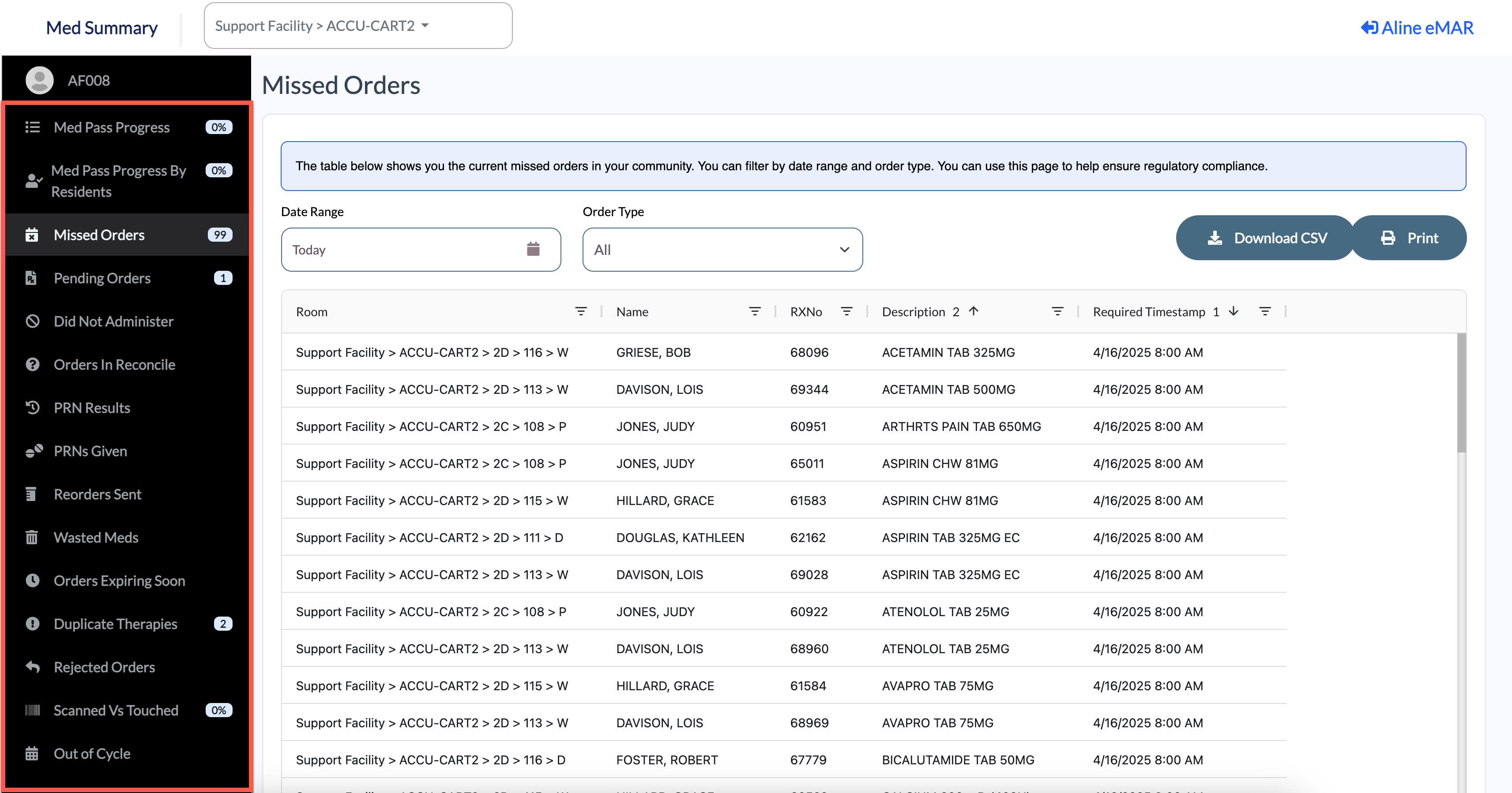 With Med Summary, Aline eMAR users can review their operation from a high level, sort and filter data as needed, and export the data out of the application.