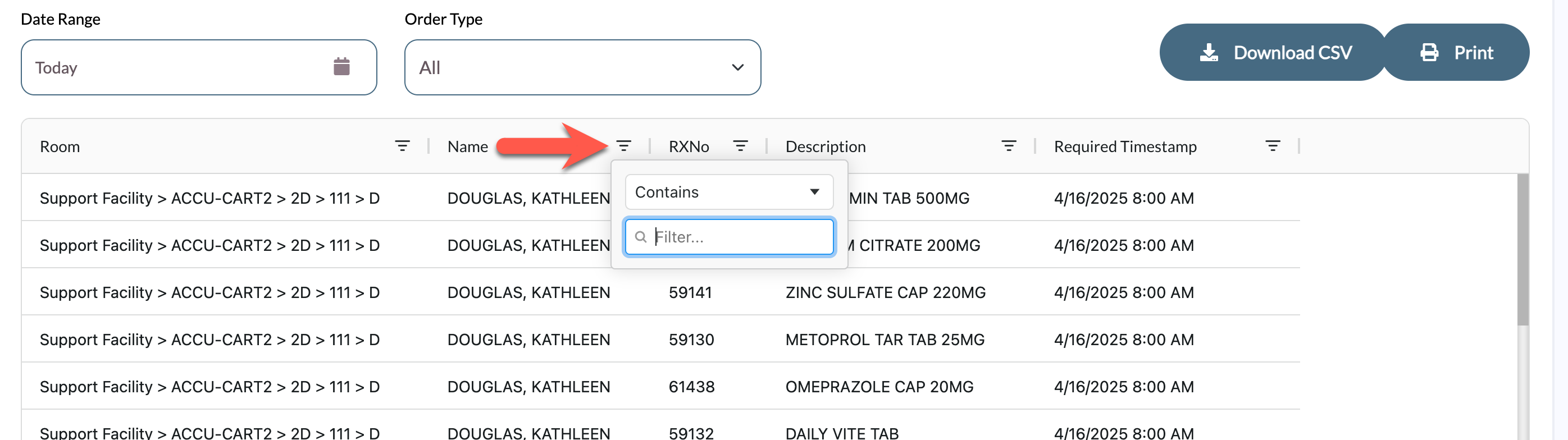 Columns cab also be dragged and dropped to reorder the information. Use the Print button to print the data or the Download CSV button the download the data to your device.