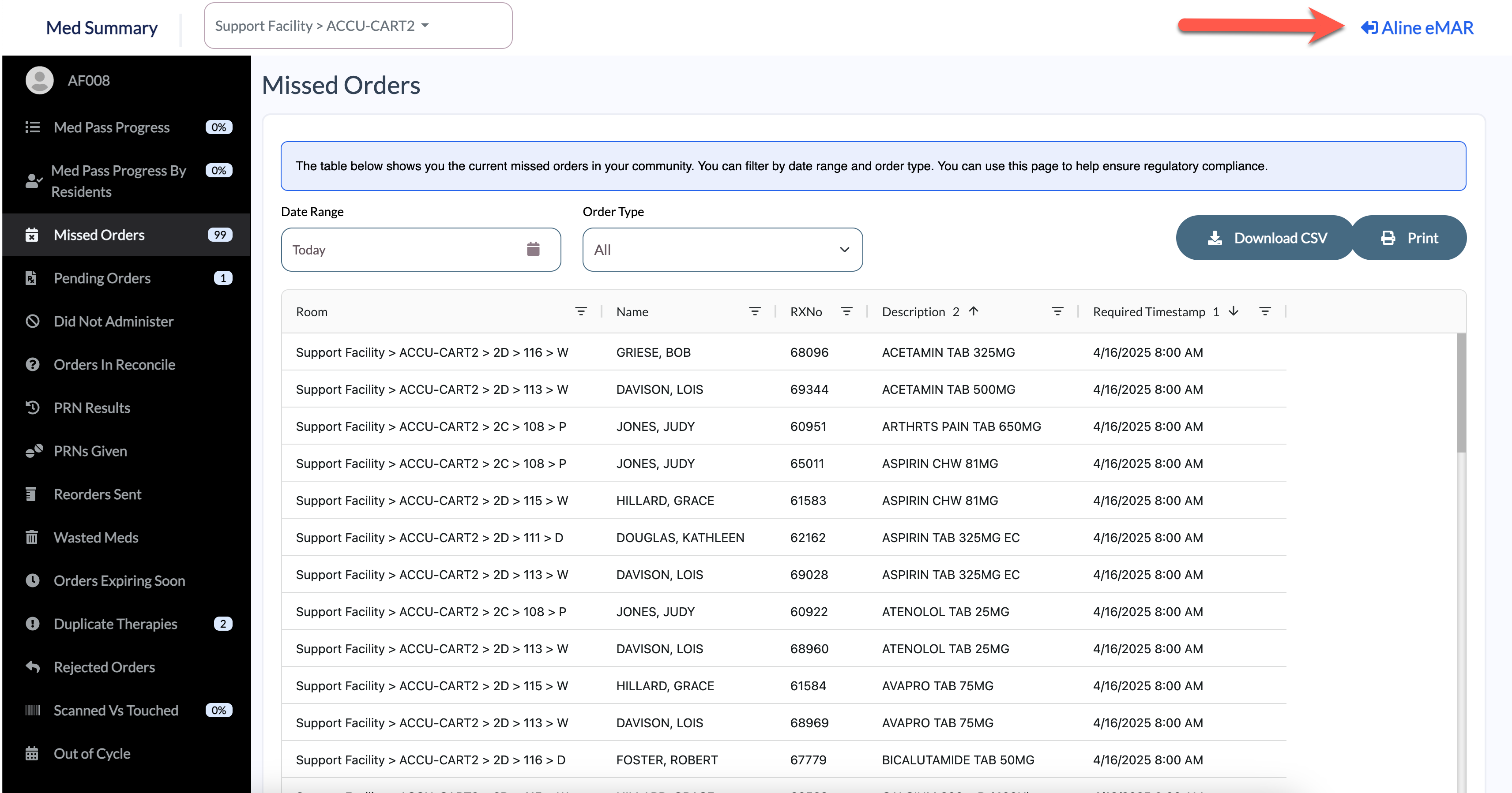 Step 4: To return to the Aline eMAR dashboard, select Aline eMAR in the upper right-hand corner.