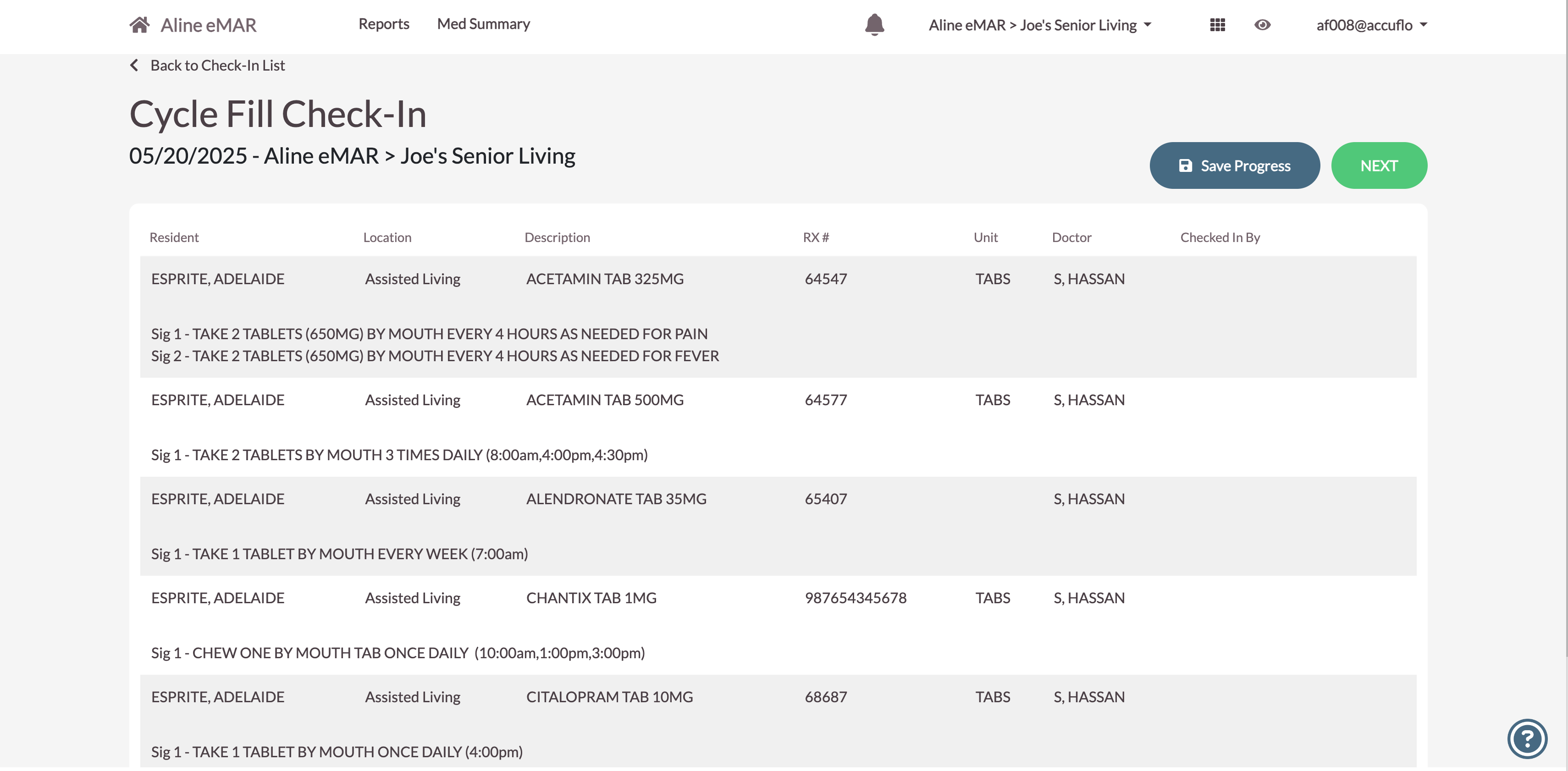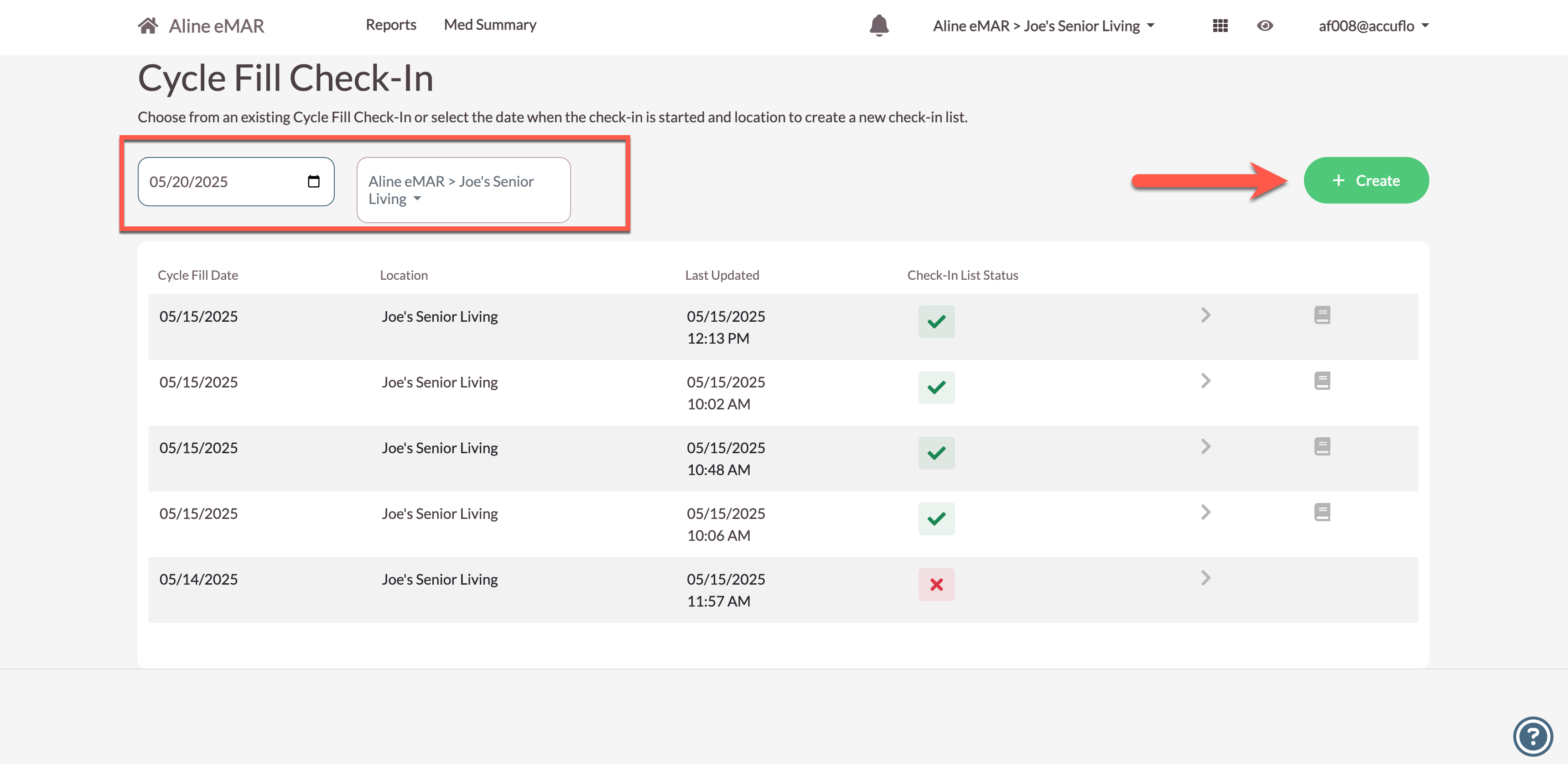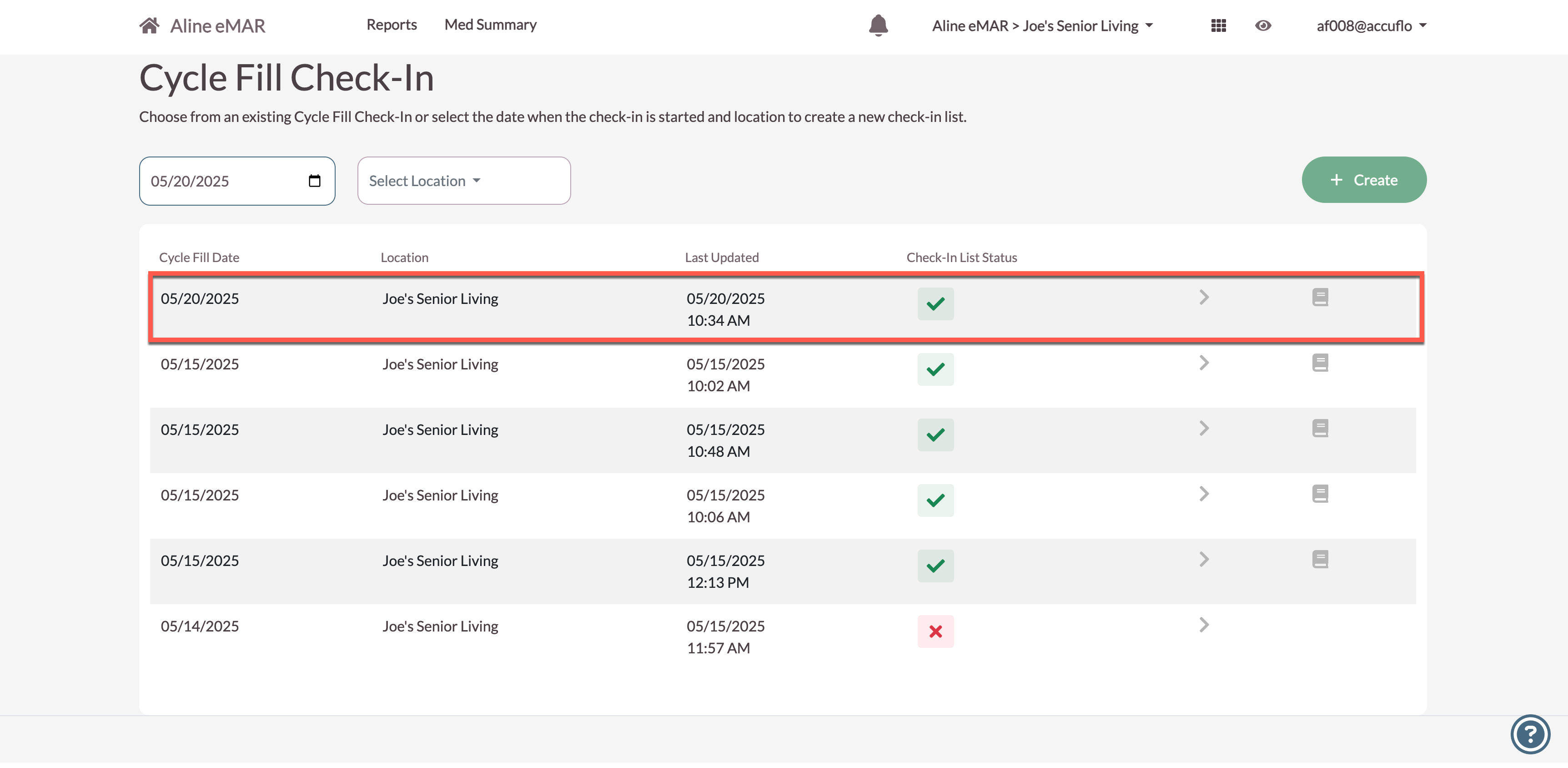 For organizations or communities that have the Cycle Fill Check In tool enabled, users will be able to create manifests, or checklists, for cycle fill labeled medications in order to compare pharmacy deliveries to Aline eMAR Cycle Fill documentation. This process allows accurate cycle fill check ins and easy reporting to the pharmacy for any potential missing shipments.