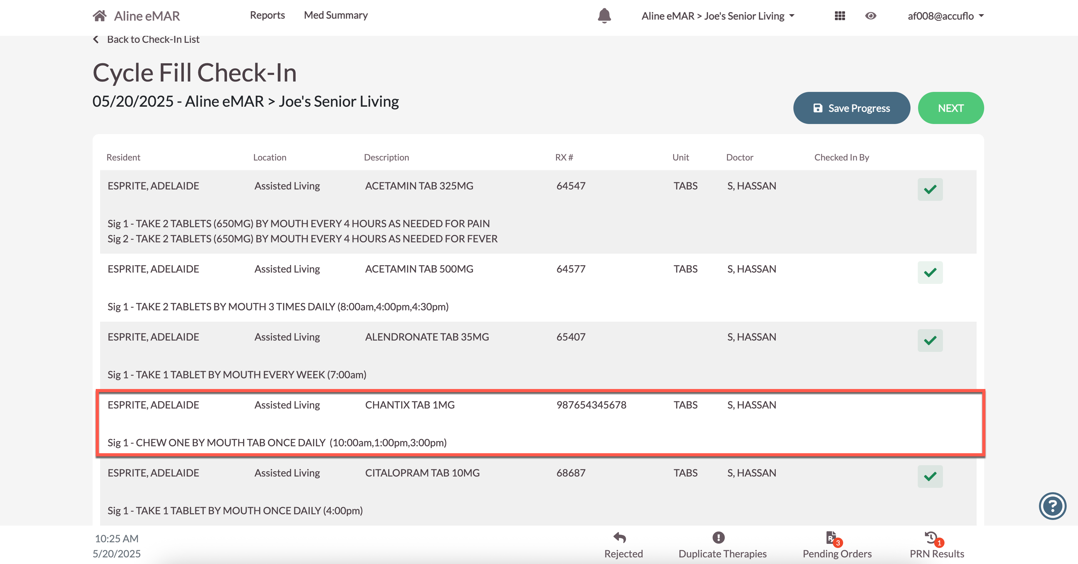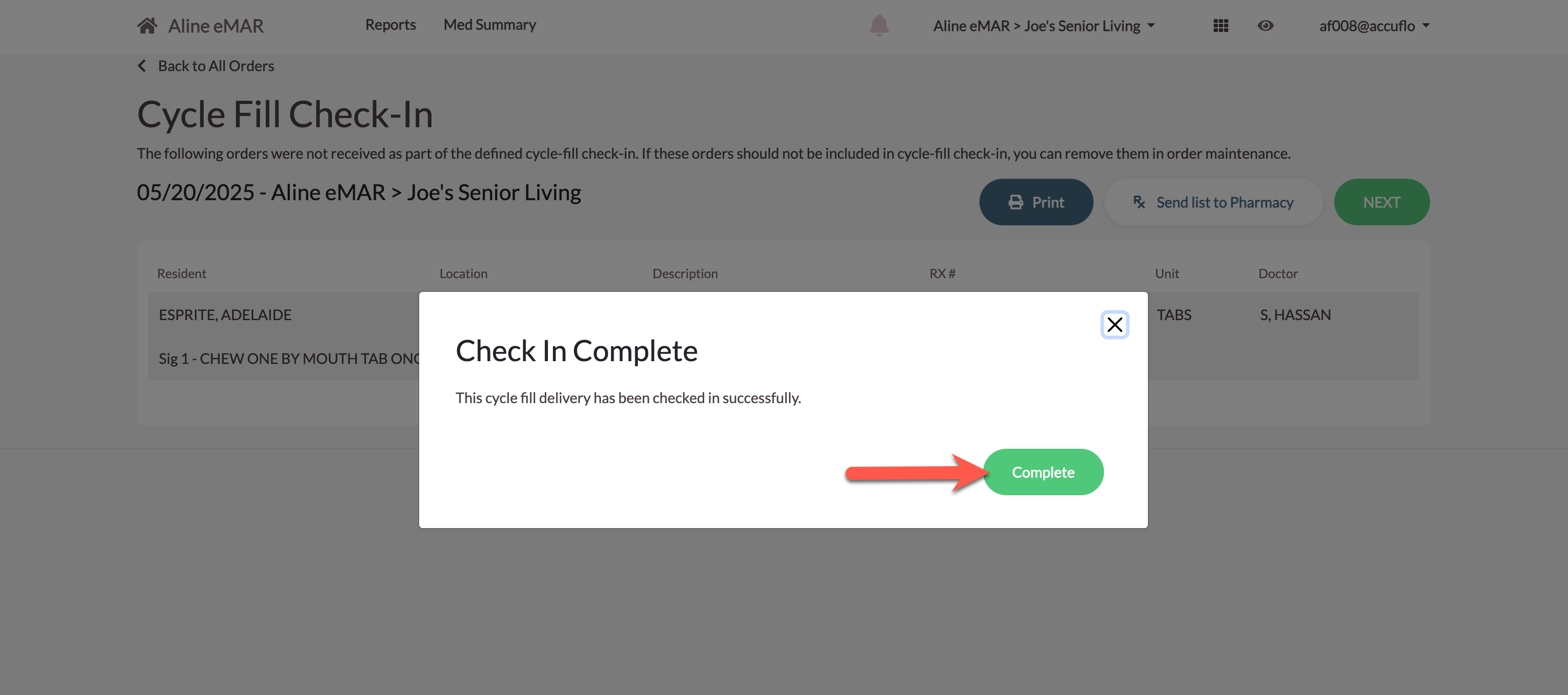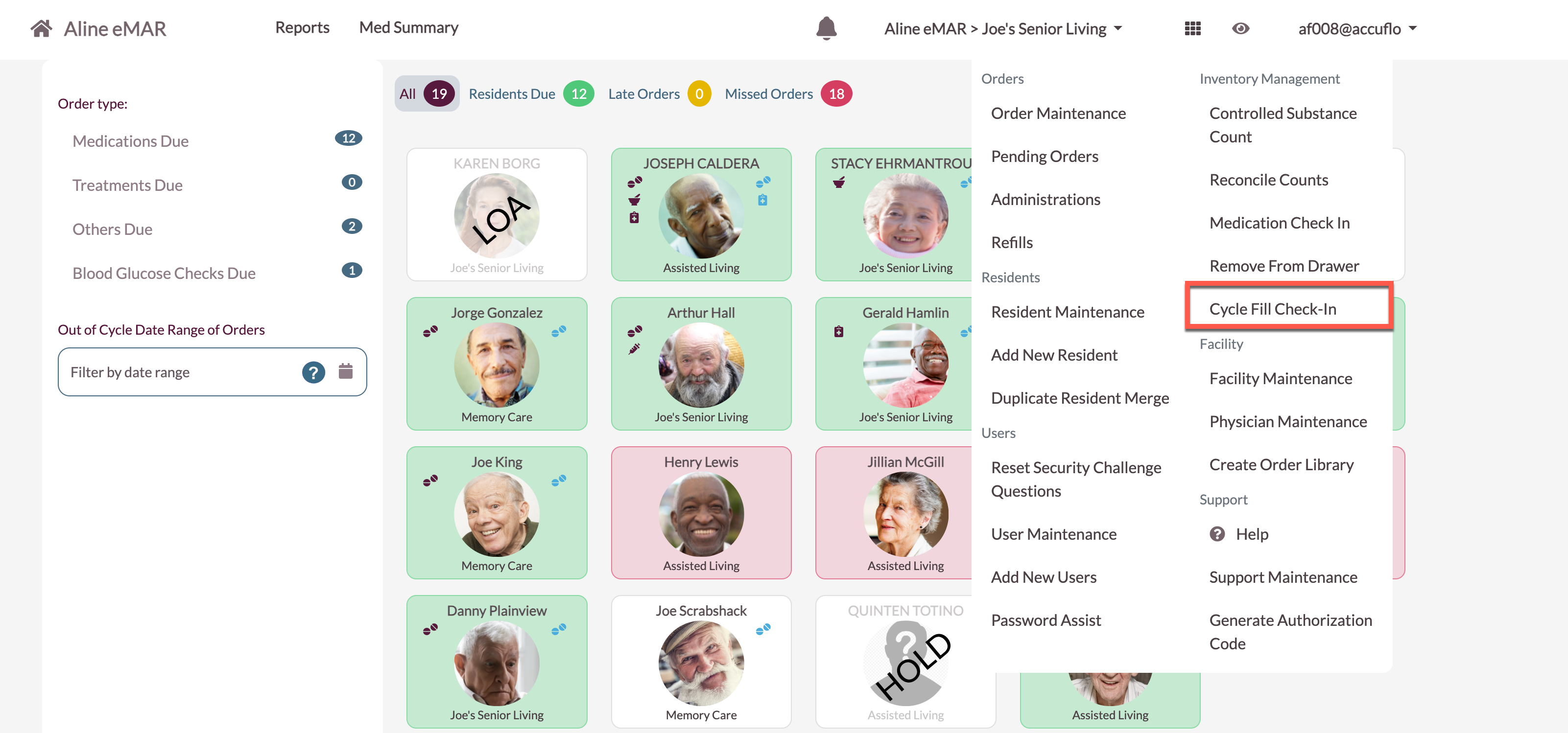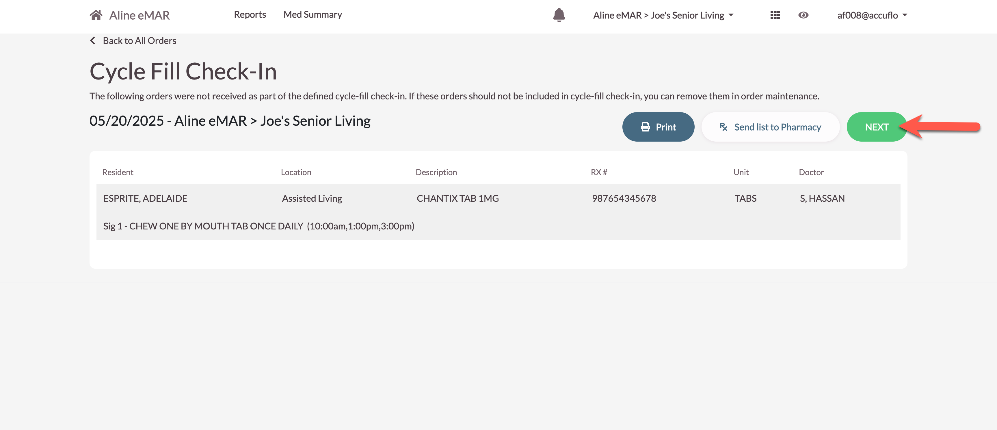 For organizations or communities that have the Cycle Fill Check In tool enabled, users will be able to create manifests, or checklists, for cycle fill labeled medications in order to compare pharmacy deliveries to Aline eMAR Cycle Fill documentation. This process allows accurate cycle fill check ins and easy reporting to the pharmacy for any potential missing shipments.